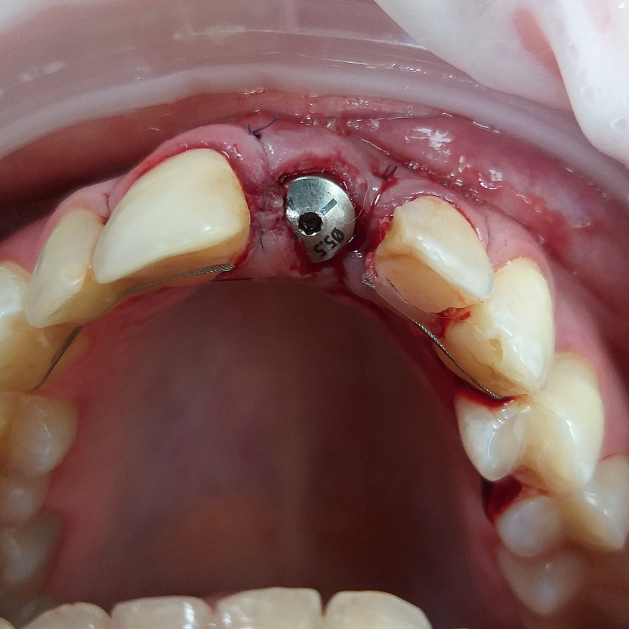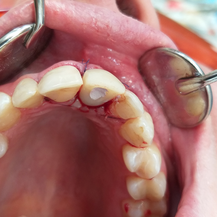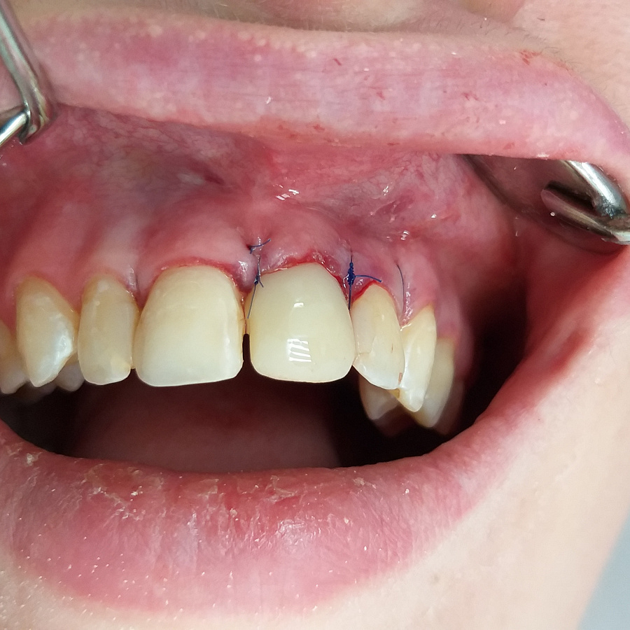Следующий этап после удаления разрушенного корня и установки зубного имплантата - восстановление косметического дефекта временной коронкой, изготовленной после операции.
