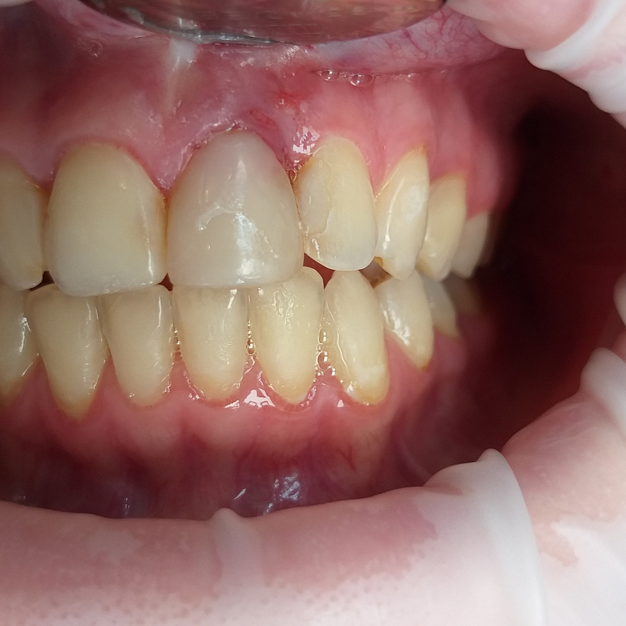 Пациентка обратилась в клинику с жалобами на воспаление десны в области переднего зуба верхней челюсти, необычный вид десны, кровоточивость десны во время чистки зубов.