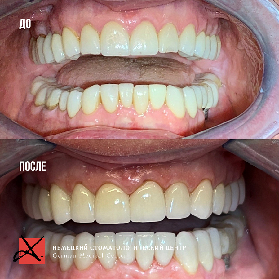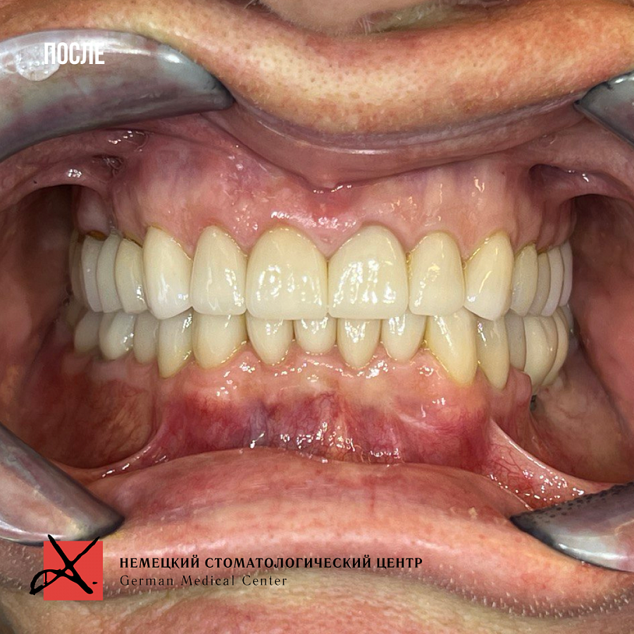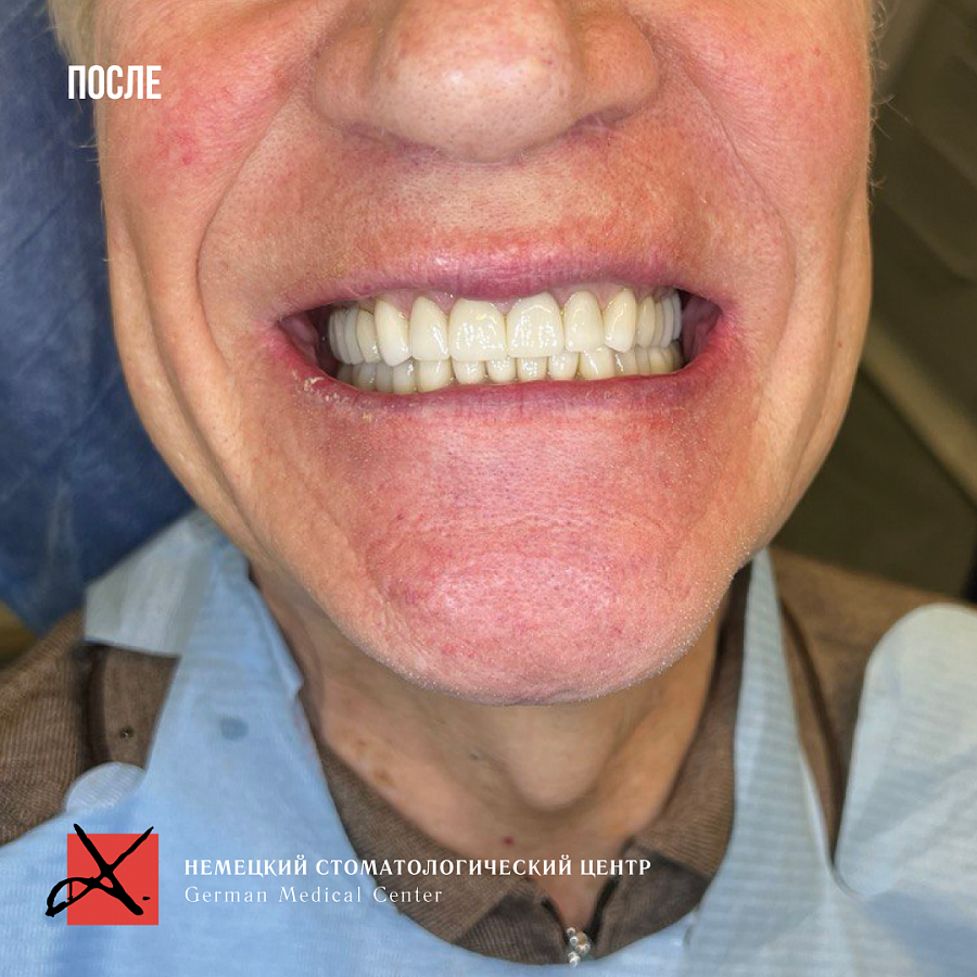 Доктора Немецкого Стоматологического Центра смогли найти решение для данного сложного случая. Была проведена комплексная реабилитация: переделаны передние зубы, частично переделаны боковые зубы, был удален несостоятельный имплантат и проведена повторная зубная имплантация. Благодаря грамотной реабилитации мы получили правильно сформированную жевательную поверхность, смыкание зубов в нужной высоте, декомпрессию сустава. В результате у пациента прошли все болевые синдромы и дискомфорт. Пациент наблюдается в Центре уже боле 2 лет, никаких сколов, проблем с суставом и жалоб больше нет.