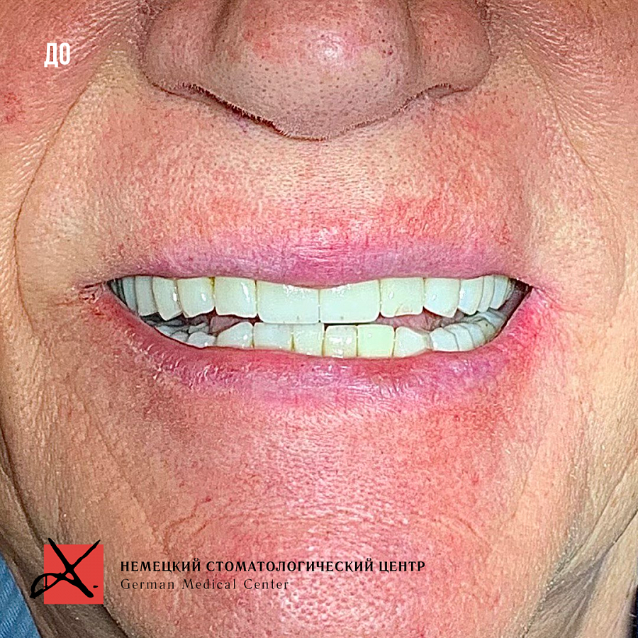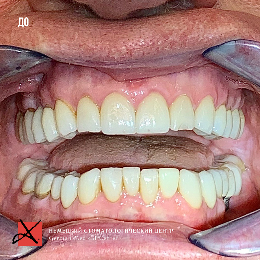 Пациент обратился в Немецкий Стоматологический Центр с жалобами на трудности в открывании рта и пережевывании пищи, напряжение и боли в челюстном суставе. Все эти проблемы появились после лечения в одной московской клинике, где пациенту сделали полное протезирование зубов. В результате этого протезирования снизилась высота нижней третьей лица, что вызвало компрессию суставов. Компрессия в свою очередь привела к многочисленным сколам керамики, суставным и мышечным болям.