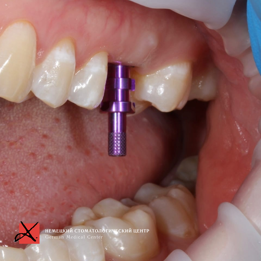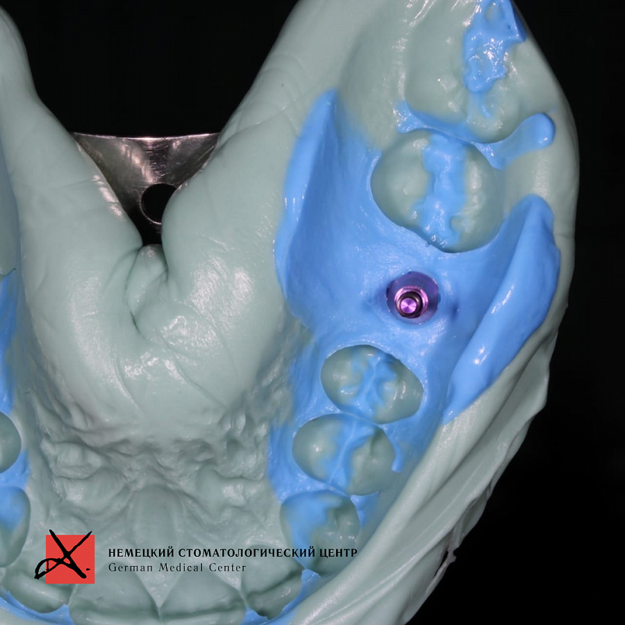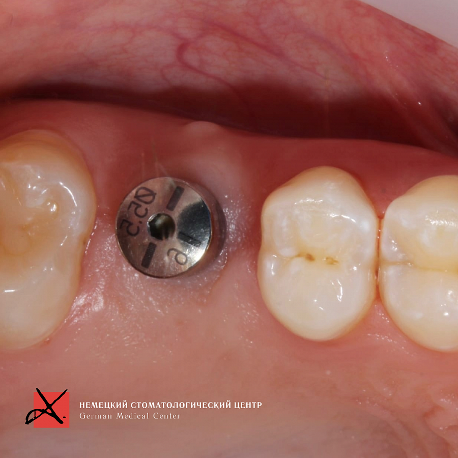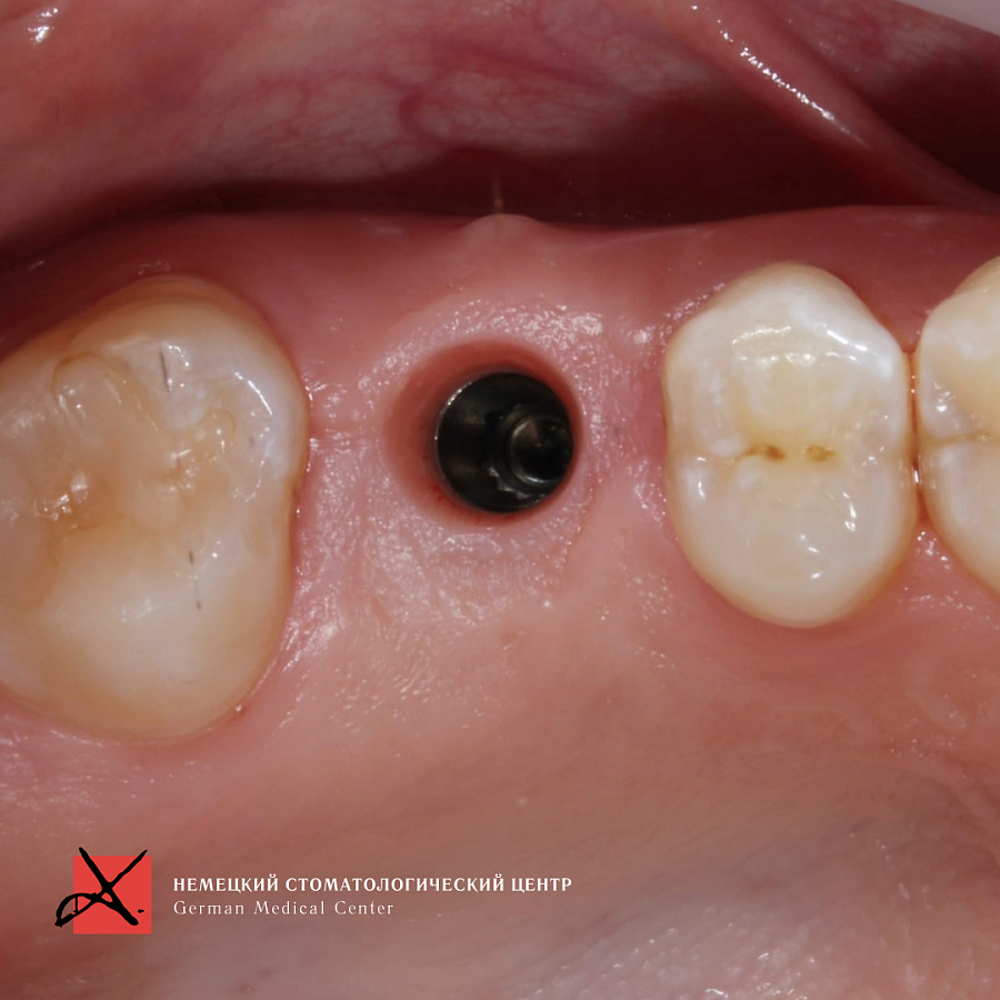 Провели костную пластику с последующей имплантацией. Материал для пластики - Geistlich Bio - Oss ( Био Осс ) - натуральный костнозамещающий материал, покрытый мембраной. Через 6 месяцев провели имплантацию и далее протезирование.