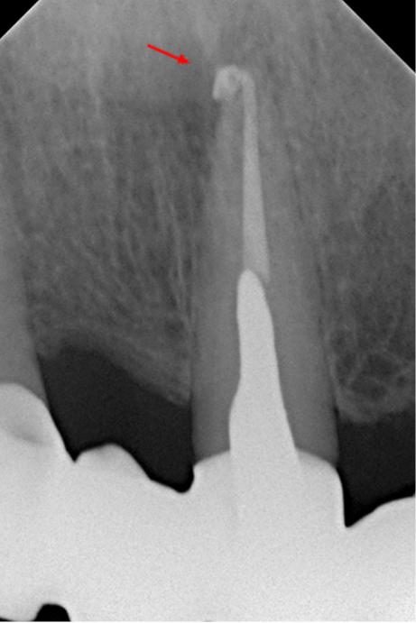 Пациент 55 лет обратился с жалобами на длительные болевые ощущения в левом переднем сегменте верхней челюсти. По словам пациента в свое время первый резец был депульпирован. При этом к клинике, где депульпировали зуб, пациенту сказали, что в дальнейшем проблем с ним не возникнет.