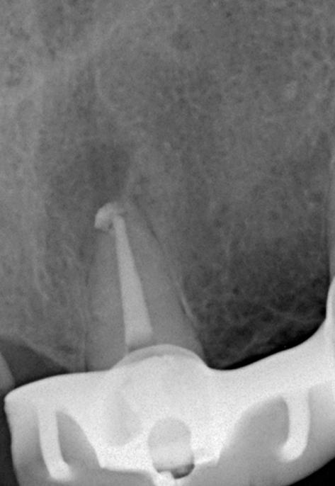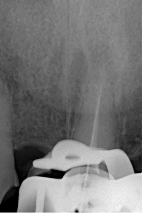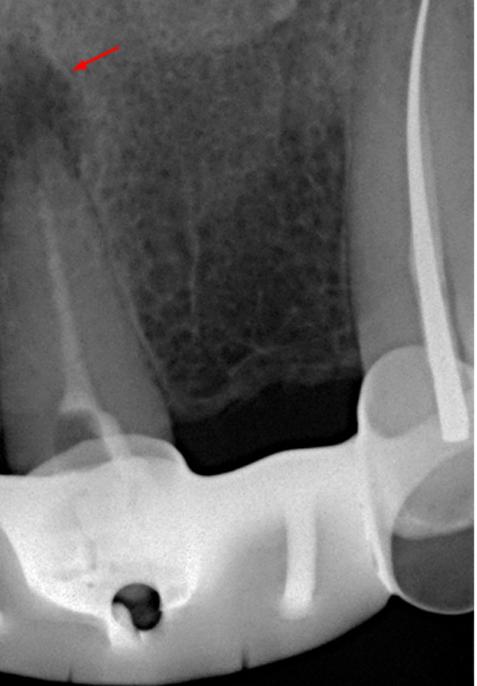 Выявлена болезненность при перкуссии и пальпации в области 21 зуба. Зуб не реагирует на термические раздражители. Результаты пародонтологического обследования в пределах нормы, рентгенологическое обследование выявило радиолюцентную зону в области верхушки корня (снимки 1, 2).
