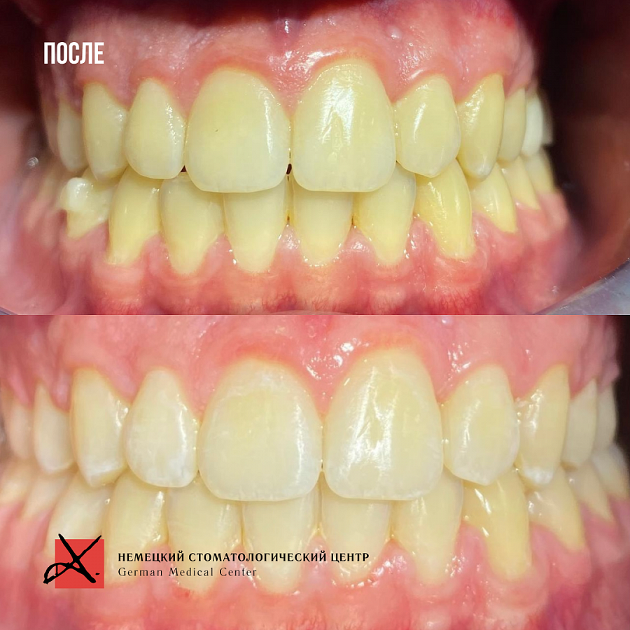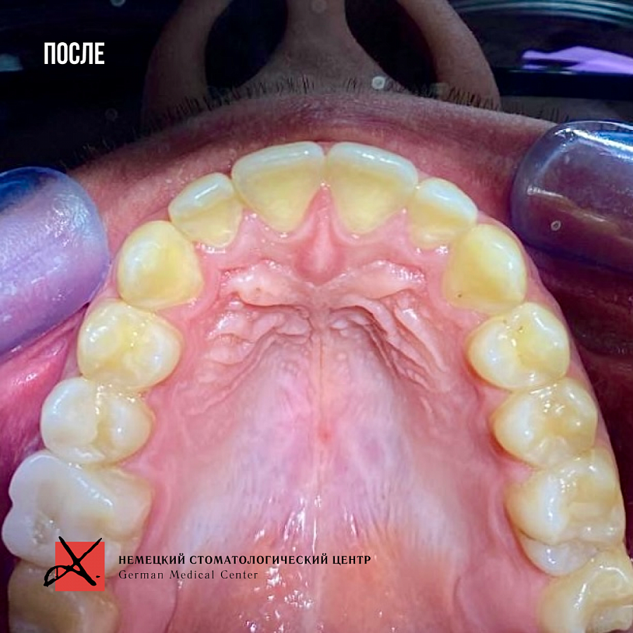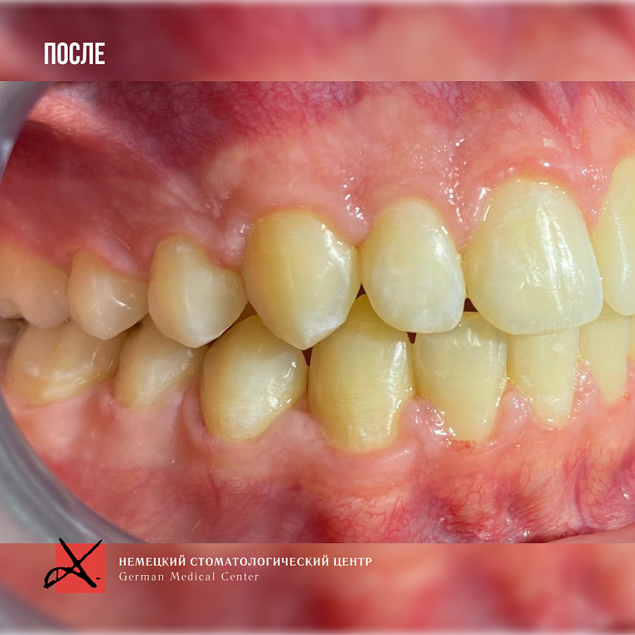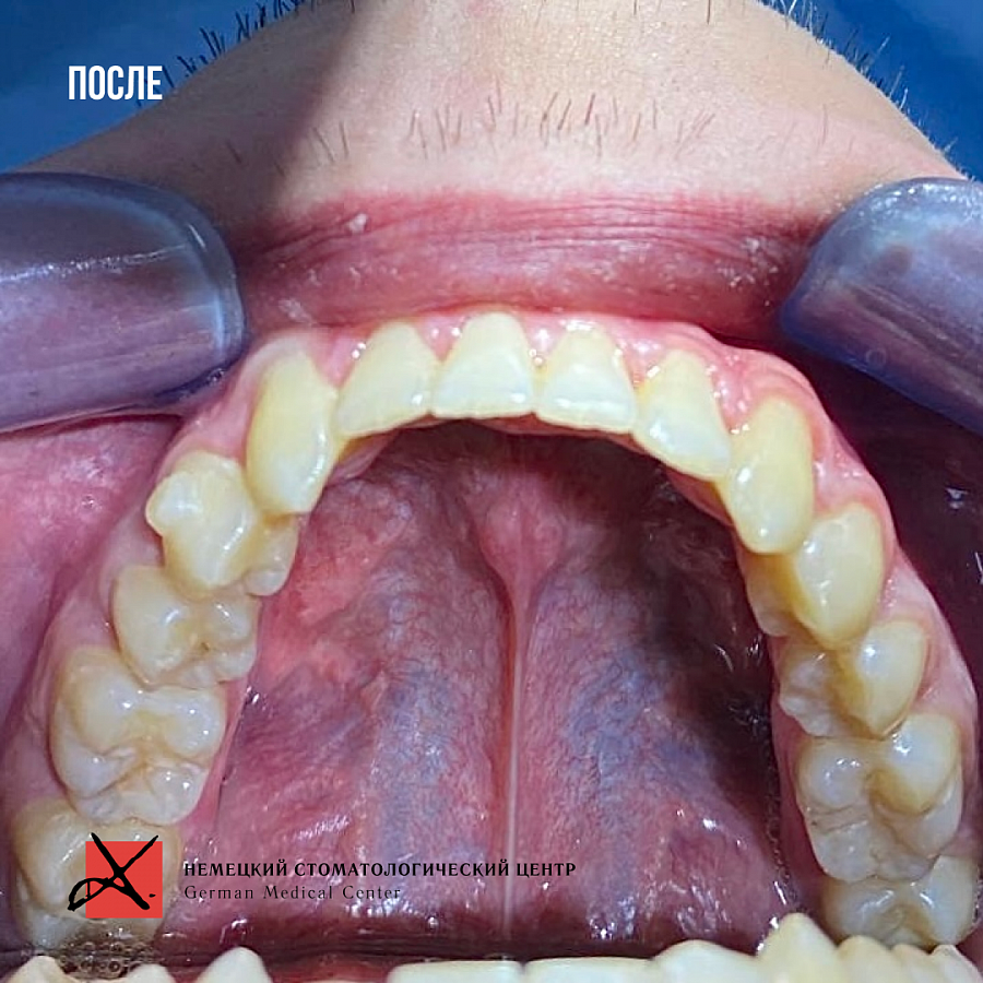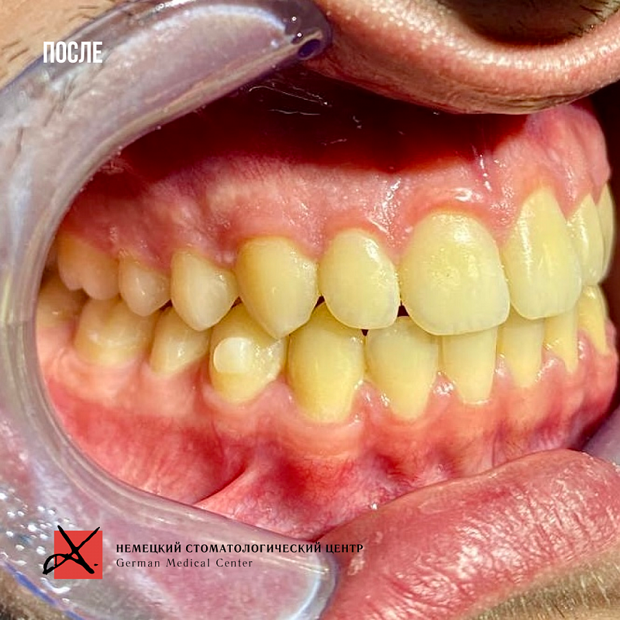 Все проблемы, с которыми пришел пациент, были решены. Результаты работы особенно явно заметны на фото до и после. Обратите внимание на то, как смыкаются зубы после лечения, насколько изменился прикус.