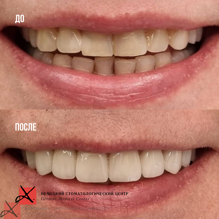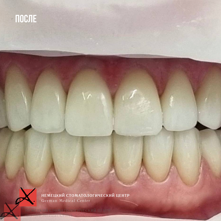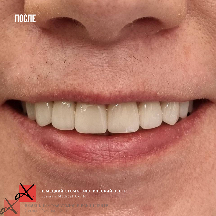 Пациентка очень довольна результатом, зубы выглядят красиво и естественно.