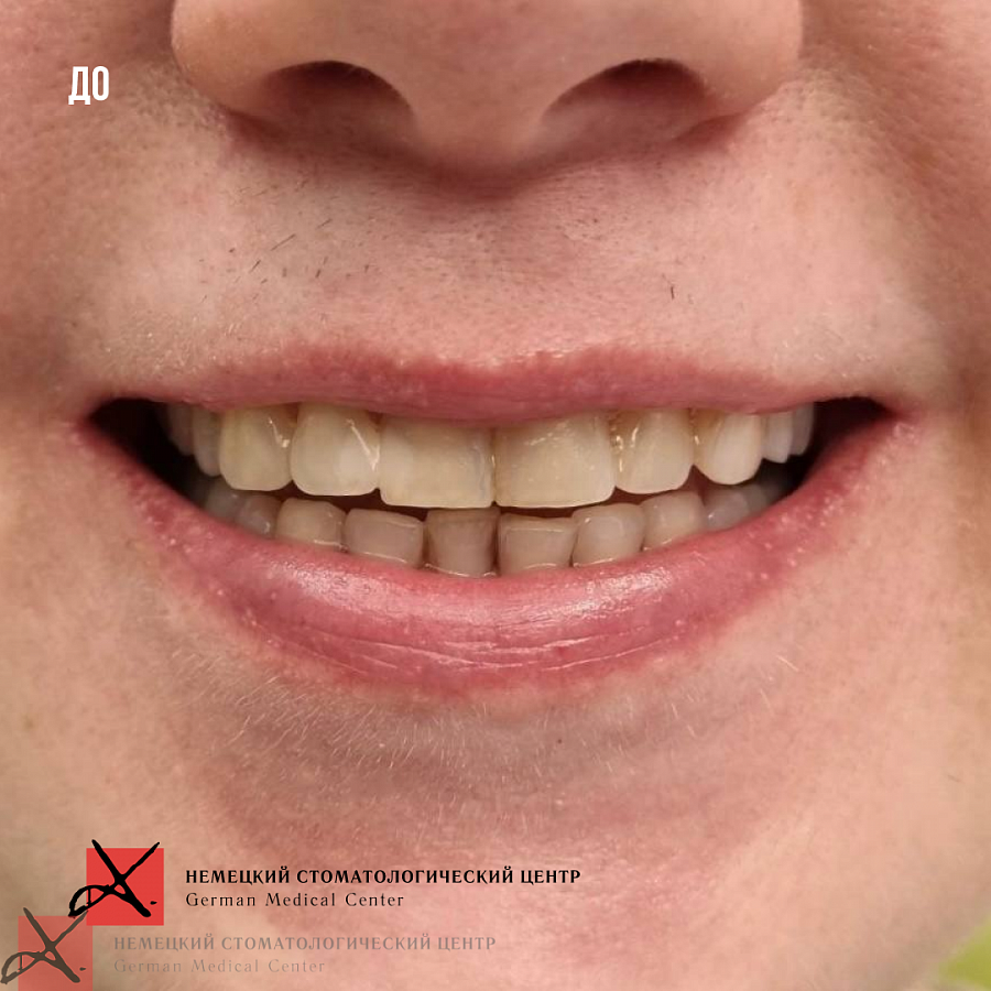 Был ряд вопросов, которые необходимо было решить: кариес и его осложнения, множественные пломбы во фронтальной группе, запрос на улучшение внешнего вида зубов.