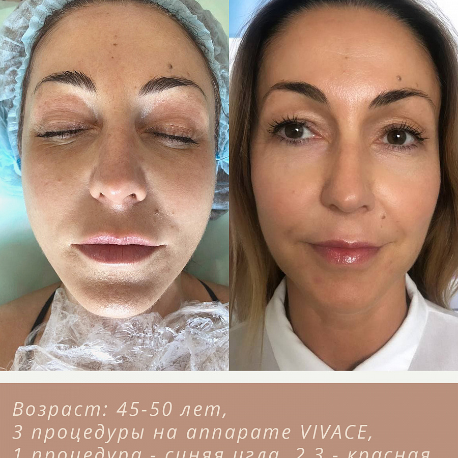 Возраст: 45 лет, 3 процедуры на аппарате VIVACE, 1 процедура - синяя игла, 2,3 - красная