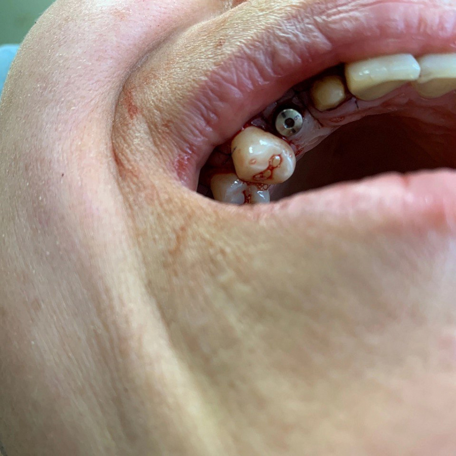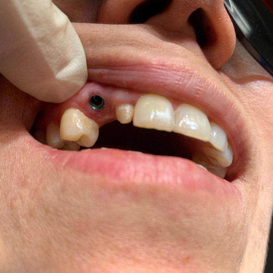 Пациент обратился к врачу-ортопеду с целью протезирования имплантата, установленного ранее в другой клинике. Однако из-за неадекватного положения имплантата изготовить полноценную функциональную и эстетически красивую коронку не представлялось возможным. Поэтому проведено удаление имплантата и повторная имплантация в более правильную позицию.