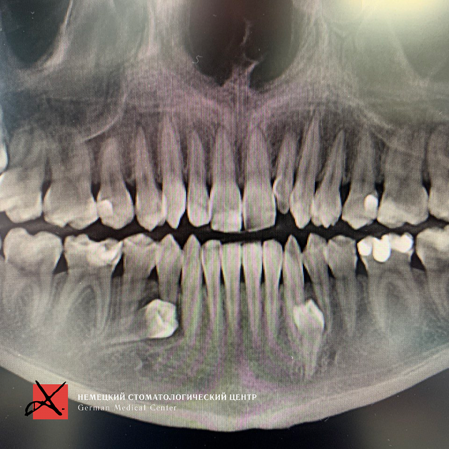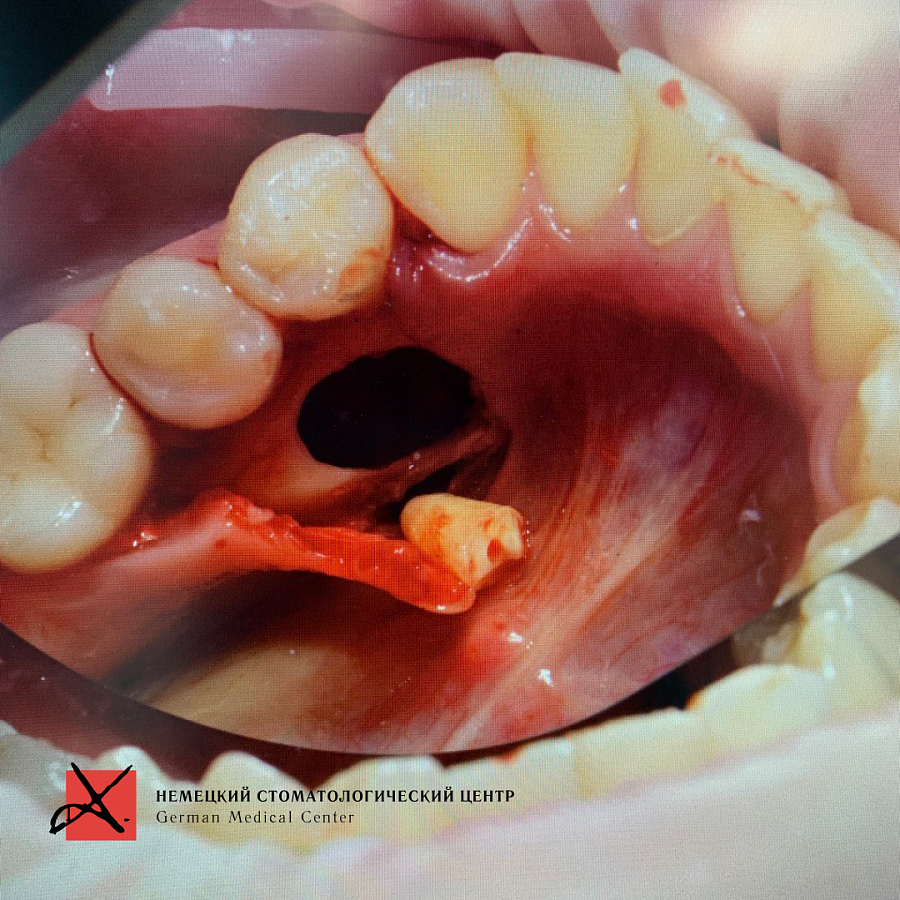 Зубы были удалены через окошко в кости, сделанное изнутри полости рта со стороны языка. Заживление прошло отлично, пациент ни на что не жалуется, соседние зубы не были повреждены.