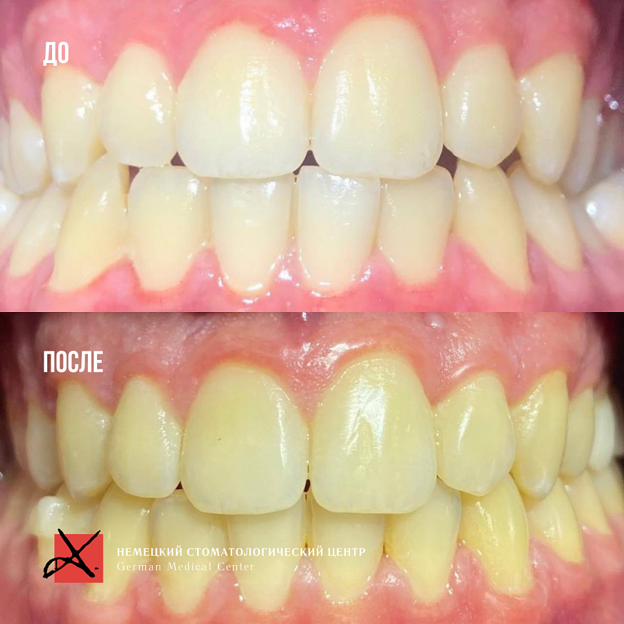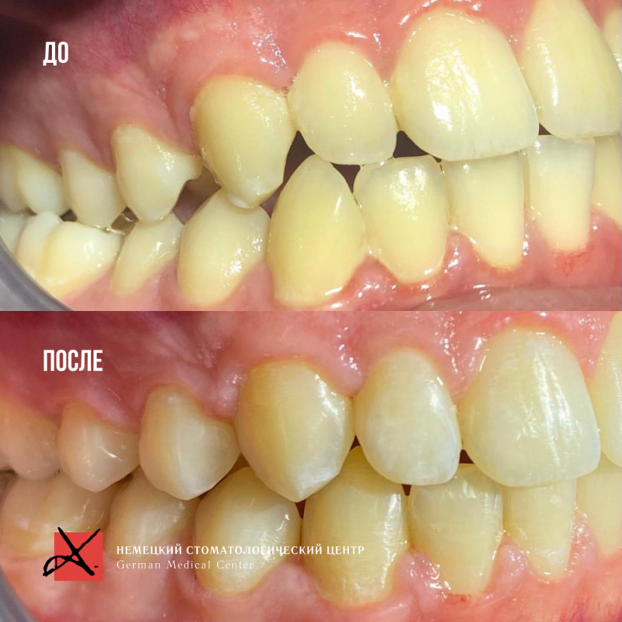Все проблемы, с которыми пришел пациент, были решены. Результаты работы особенно явно заметны на фото до и после. Обратите внимание на то, как смыкаются зубы после лечения, насколько изменился прикус.